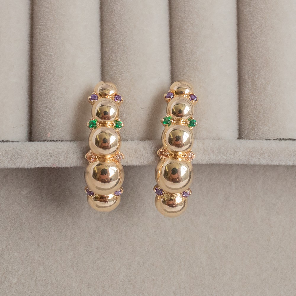 O Brinco Ear Hook Meia Esfera é produzido a partir de ligas metálicas banhadas em ouro 18 quilates e possui aplicação de zircônias coloridas. O tamanho é 2,7 de altura.