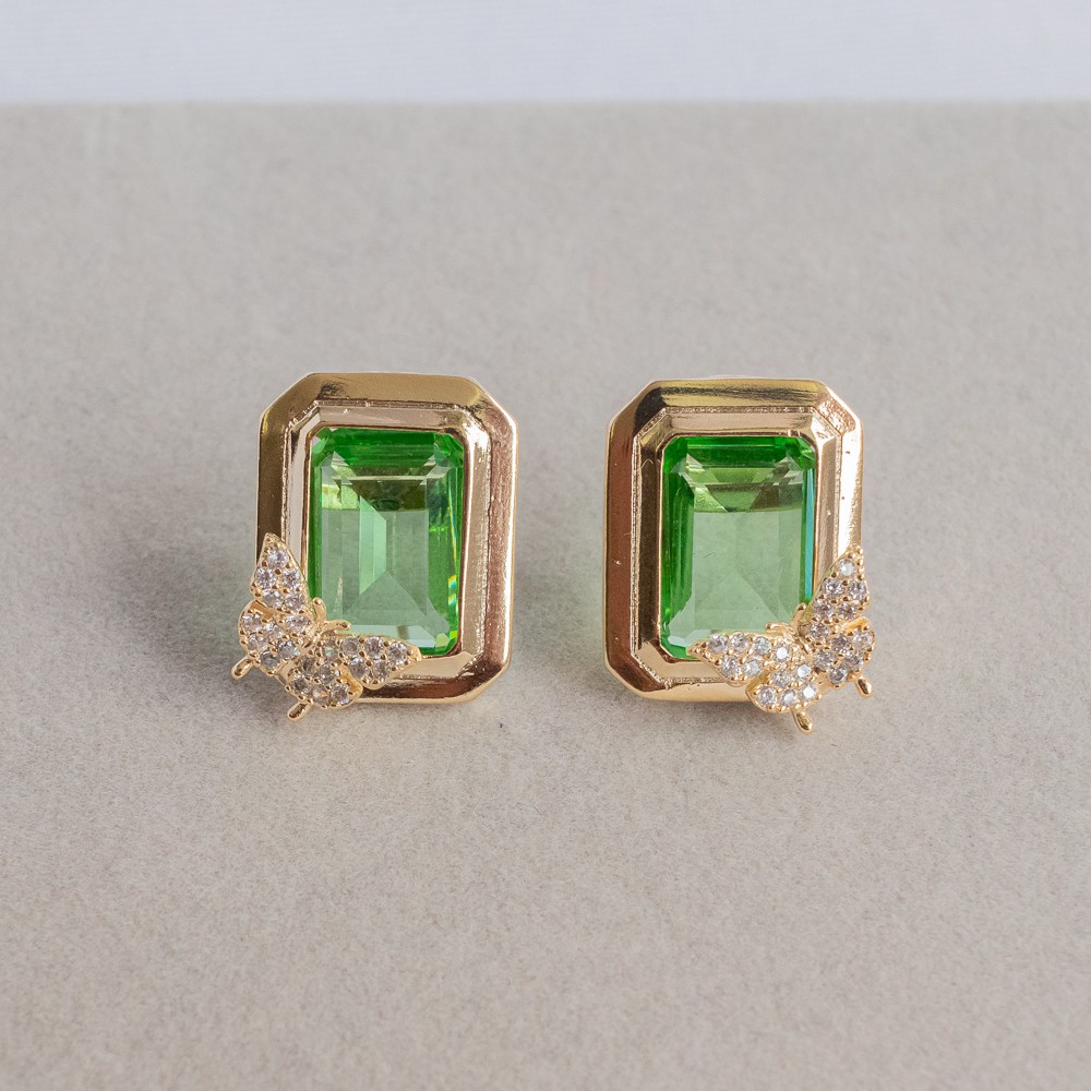 O Brinco Esmeralda e Borboletas é produzido a partir de ligas metálicas banhadas em ouro 18 quilates e possui aplicação de zircônia na cor esmeralda e borboleta com cravação de micro zircônias. O tamanho é 1,8 de altura e 1,5 de largura.