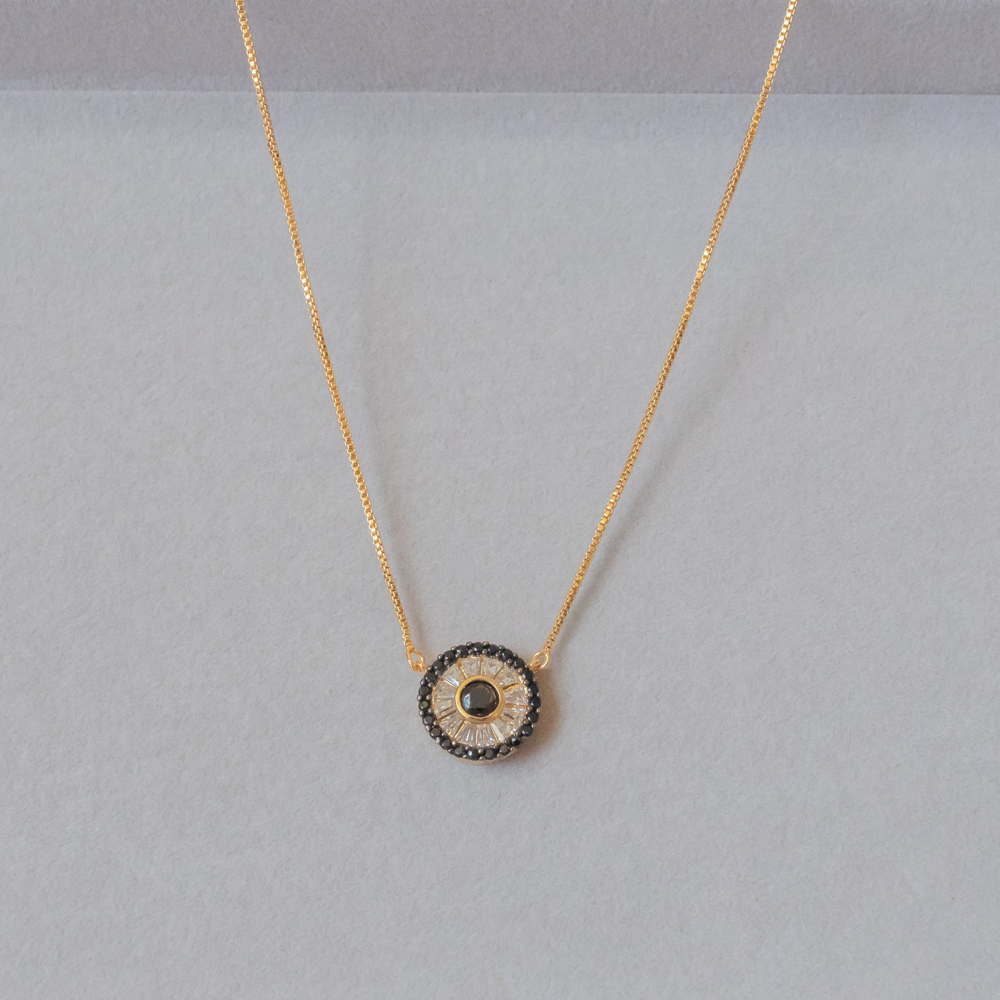 Colar pizza é produzido a partir de ligas metálicas banhados em ouro 18 quilates e possui um pingente fixo com cravação de micro zircônias brancas e pretas. Tamanho é de 41,5 cm +3 cm de extensor.