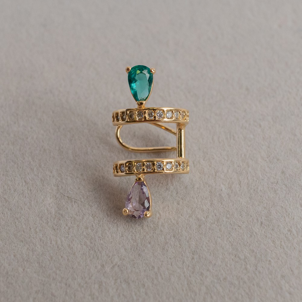 Piercing Fake Tanzanita e Esmeralda é produzido a partir de ligas metálicas banhados em ouro 18k, aplicação de zircônias nas cores tanzanita e esmeralda e cravação micro zircônias brancas. O tamanho é 1,7cm de altura.